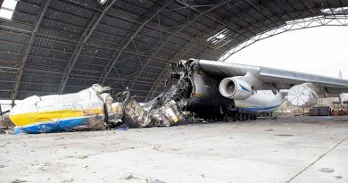Az Antonov An-225 repülő példánya megsemmisült a háborúban. A második An-225 repülőgépnek a törzse van meg. Zelenszkij ukrán elnök szerint